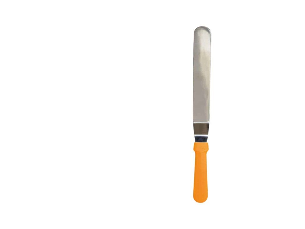 Celková délka 38 cm, materiál nerezová ocel, plastová oranžová rukojeť, ergonomický tvar, ideální pro roztírání krémů a polev.